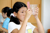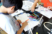 ふだん使っている色ペンの「色」を分解して、どんな色から出来ているのかを調べました。ろ紙にペンで点を打ち、水を染み込ませるとインクが2色や3色に分かれました。紫色は赤色と青色…緑は黄色と青色…など、選んだ色によって結果が違うので、みんなで見くらべたりも。