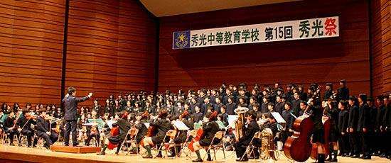 ■一人ひとりが担当楽器を受け持ち… 秀光中等教育学校の教育理念“Language,Music and Science”。そのMusicを象徴する舞台がこの秀光祭です。初期の段階でフルートやトランペットなどの管楽器をひととおり体験。その後、専門の楽器を決めて、演奏能力を高めていきます。 |