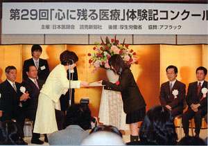 | 根本さんは、膵臓がんを患った祖母との闘病生活の中で感じたことや医療への提案などをつづりました。 表彰式当日は、審査員の一人であった女優の竹下景子さんから賞状が手渡されました。「とてもきれいな声で賞状を読み上げてくださり、改めて素晴らしい賞をいただいたんだなと思いました」と根本さんは女優さんを前に高揚してしまったそうです。 また、表彰式後の記念パーティーでは、審査員の一人であった作家のねじめ正一さんから「最初は生意気な文章だと思ったけど、読んでいくうちにあたたかさを感じたよ」との講評をいただきました。 医療体験の感想文が多かった中で、根本さんは鋭い視点で今後の医療がどうあるべきかを提案していることも、受賞へつながったようです。 根本さんの体験記は読売新聞(1月27日)に掲載されました。「新聞に私の文章が載ることで、全国の方に私の経験や思いを知っていただくことができました。闘病中の方や、その家族の方の励みになれたら嬉しいです」と受賞の喜びを話します。 |