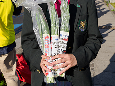 多賀城市での飲酒運転根絶大会は午後4時30分から開催されました。開会式のあと、本校生徒会執行部の生徒たちと市民のみなさんが、事故現場近くの国道45号線沿いで安全運転を呼びかけました。生徒たちは国道を走る信号待ちのドライバーに多賀城市の特産品で「ニラめ運動」にちなんだニラなどを配り、「安全運転をお願いします」などと声をかけていました。